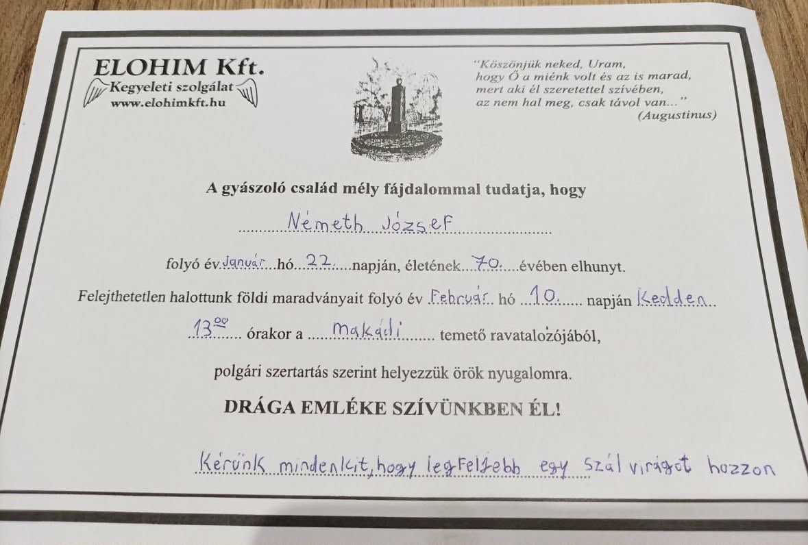 Szomorú szívvel tudatjuk mindazokkal, akik ismerték és szerették, hogy Németh József 2026. január 22-én, életének 70. esztendejében elhunyt.